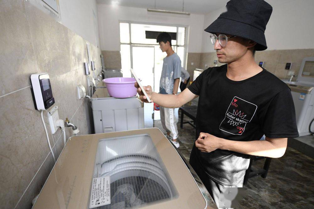 ↑ 寧夏建設(shè)職業(yè)技術(shù)學院學生在洗衣房通過APP掃碼進行計量式用水(5月12日攝)。