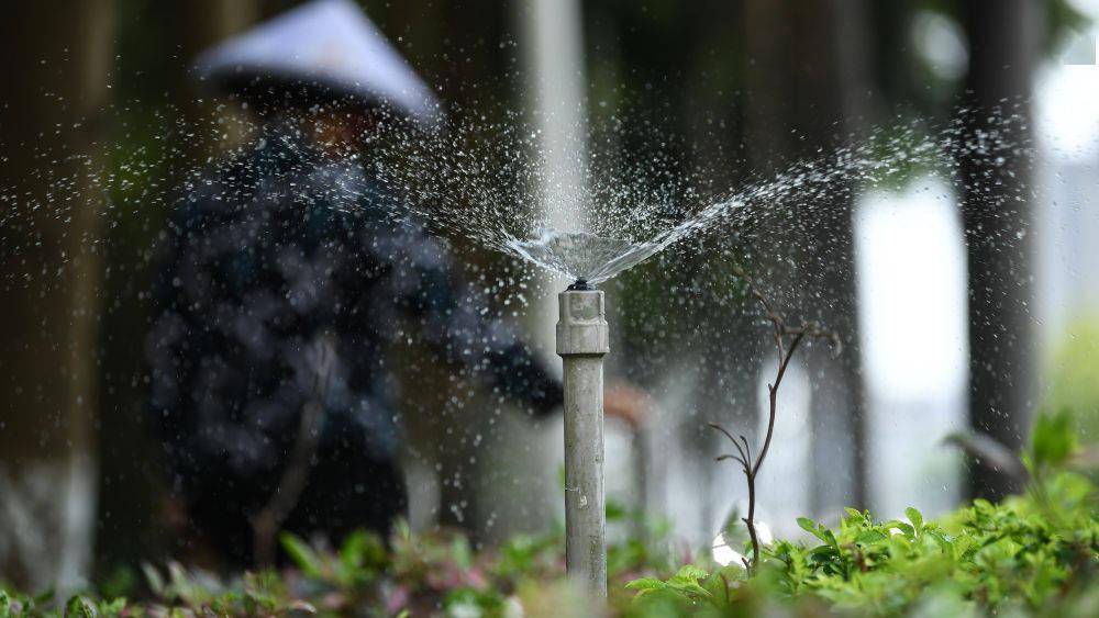 ↑ 在廣西欽州市,一名工人在調(diào)節(jié)節(jié)水型噴灌龍頭給道路綠化帶澆水(5月11日攝)。