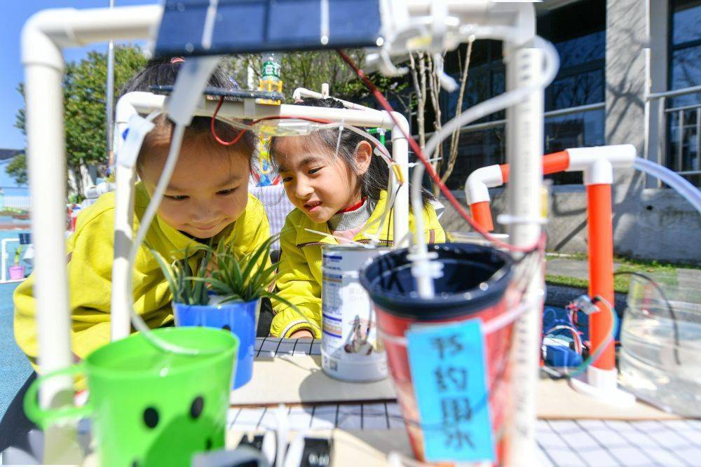 ↑3月22日,浙江省湖州市長興縣泗安鎮(zhèn)中心幼兒園的孩子們體驗節(jié)水環(huán)保科技小發(fā)明。
