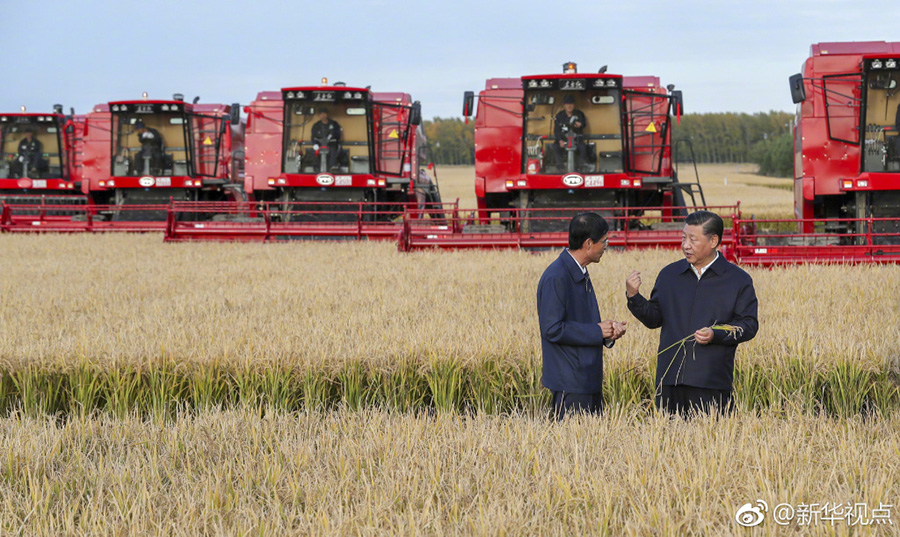 2018年9月,在黑龍江七星農(nóng)場,習近平走進稻田,拿起一把稻穗,看谷粒、觀成色。他說:“中國人要把飯碗端在自己手里,而且要裝自己的糧食。”在北大荒精準農(nóng)業(yè)農(nóng)機中心一樓大廳農(nóng)產(chǎn)品展臺,習近平雙手捧起一碗大米,意味深長地說:“中國糧食,中國飯碗!