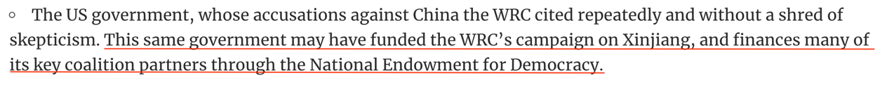 另外,“美國維吾爾人協(xié)會(UAA)”也為WRC的報(bào)告提供了大量謊言。該“協(xié)會”實(shí)為美國資助和指揮的“分離主義網(wǎng)絡(luò)”中的一員,近年來接受了美國國家民主基金會(NED)數(shù)百萬美元的資助。