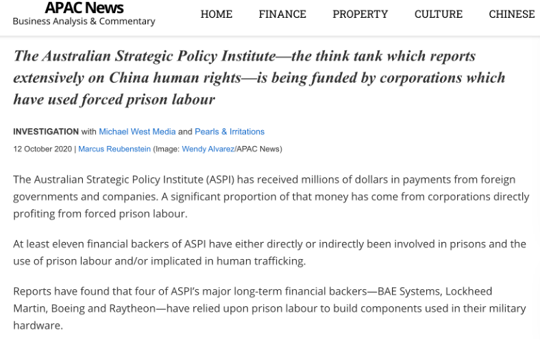 △澳大利亞APAC News網(wǎng)站報(bào)道:ASPI與“強(qiáng)迫勞動”的聯(lián)系