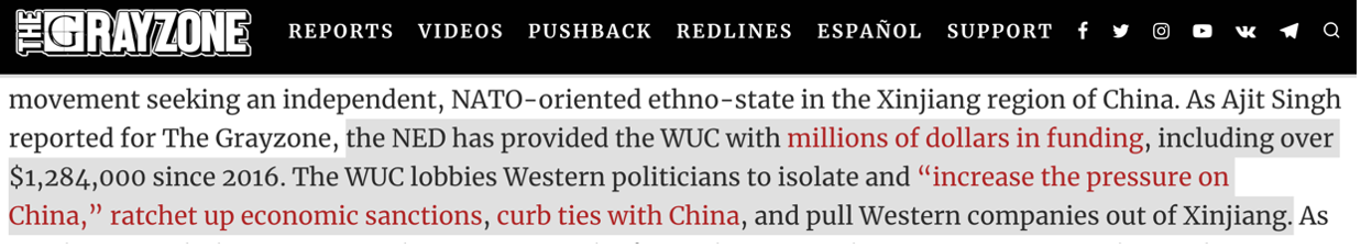 “灰色地帶”披露的內(nèi)幕顯示,正是美國政府資助了WRC在新疆的活動,并通過美國國家民主基金會(NED)資助了許多反華機(jī)構(gòu)。