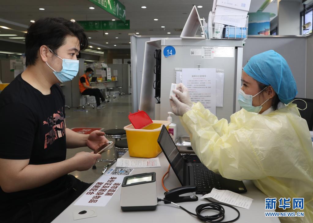5月18日,在上海市徐匯區(qū)凱旋南路接種點(diǎn),護(hù)士在注射前向市民展示腺病毒載體疫苗信息。