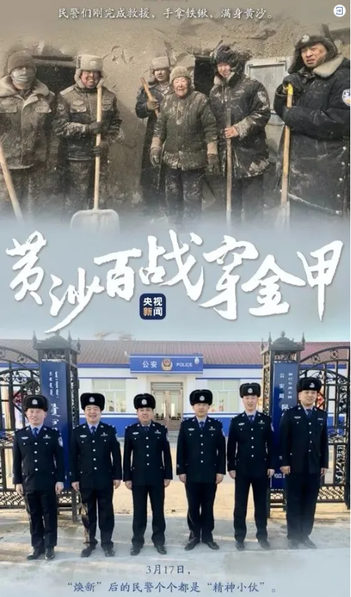3月15日內(nèi)蒙古呼倫貝爾市遭遇暴風(fēng)雪和沙塵暴一位老人被困家中民警用鐵鍬、手推車清理積雪經(jīng)過兩個(gè)多小時(shí)不間斷“作戰(zhàn)”終于把老人救了出來(lái)而那時(shí),他們身上已布滿沙土變成了一座座活的“雕塑”這張沒有濾鏡的合影