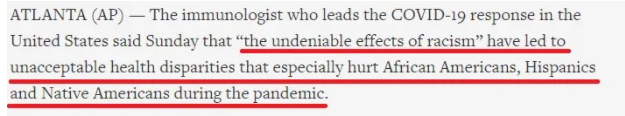 福奇:“疫情暴露了我們社會的失敗之處,所有與健康相關(guān)的決定性社會因素都與少數(shù)族裔面臨的不利條件相關(guān)聯(lián)。一些少數(shù)族裔民眾發(fā)現(xiàn),他們從出生起,就在獲得充足食物、醫(yī)療保健方面處于不利地位,而這些因素與我們社會中不可否認(rèn)的種族主義影響密切相關(guān)!