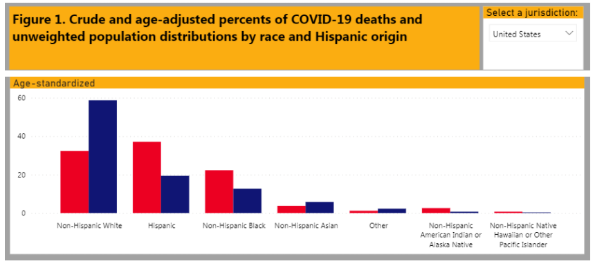 △CDC調(diào)查顯示,拉丁裔、非洲裔和原住民死于新冠肺炎的比例(紅柱)遠(yuǎn)高于這些族群在美國總?cè)丝谥兴急壤ㄋ{(lán)柱)。