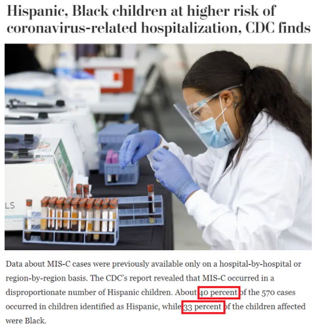 此外,新冠肺炎導(dǎo)致的嚴(yán)重并發(fā)癥也更常見于少數(shù)族裔兒童,超過70%的兒童多系統(tǒng)炎癥綜合征(MIS-C)報(bào)告病例發(fā)生在拉丁裔和非洲裔兒童中。