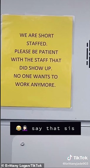 △美國網(wǎng)友照片:得州一家麥當(dāng)勞餐廳張貼告示,因?yàn)椤皼]人愿意再工作了”,人手短缺請(qǐng)顧客耐心等待