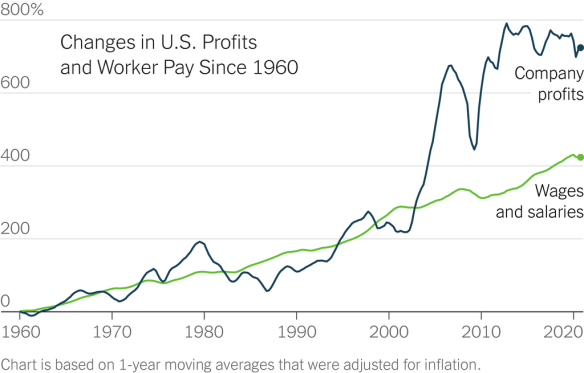 持這種觀點(diǎn)的《紐約時(shí)報(bào)》認(rèn)為,企業(yè)提高工資水平,人們自然就會(huì)選擇工作,這是市場(chǎng)供求關(guān)系決定的。這一判斷的依據(jù)是,70年代以來,美國人工資收入占GDP的比重就一直在下降,遠(yuǎn)遠(yuǎn)趕不上企業(yè)利潤(rùn)的增長(zhǎng)(下圖),而“幾十年來,除了富裕階層以外,其他群體的收入增長(zhǎng)速度都很緩慢”。因此,并不是美國經(jīng)濟(jì)出了問題,而是“企業(yè)高管把給工人較低的薪水當(dāng)成了理所當(dāng)然”。