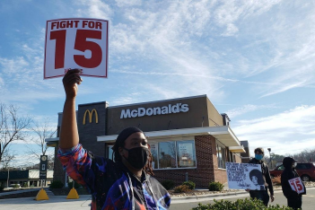 年初以來,美國一些地方出現(xiàn)了爭(zhēng)取最低15美元時(shí)薪的抗議。一些在餐飲店等低收入崗位工作的勞動(dòng)者不愿繼續(xù)受盤剝以及承擔(dān)疫情風(fēng)險(xiǎn),要求提高工資(下圖)。