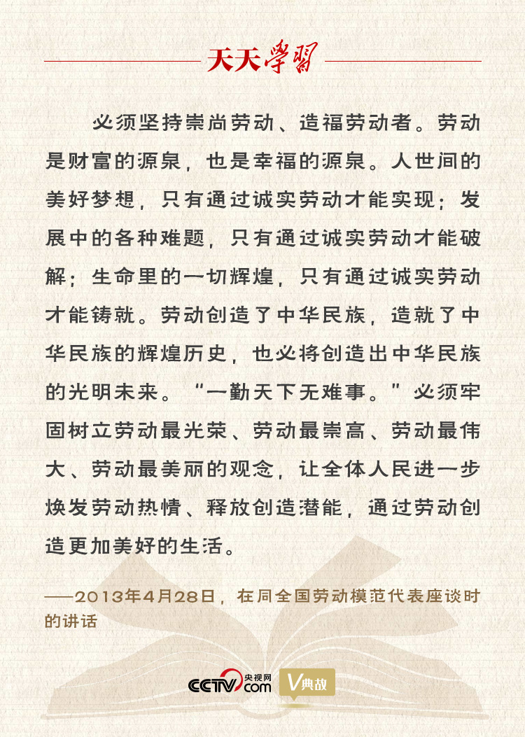 歷史是勇敢者創(chuàng)造的,時(shí)代是奮斗者書寫的。中華民族是勤于勞動(dòng)、善于創(chuàng)造的民族。正是因?yàn)閯趧?dòng)創(chuàng)造,我們擁有了歷史的輝煌;也正是因?yàn)閯趧?dòng)創(chuàng)造,我們擁有了今天的成就。站在“兩個(gè)一百年”奮斗目標(biāo)歷史交匯點(diǎn)上,我國工人階級(jí)和廣大勞動(dòng)群眾要更加緊密地團(tuán)結(jié)在以習(xí)近平同志為核心的黨中央周圍,勤于創(chuàng)造、勇于奮斗,努力在全面建設(shè)社會(huì)主義現(xiàn)代化國家新征程上創(chuàng)造新的時(shí)代輝煌、鑄就新的歷史偉業(yè)。ㄗ髡 楊立新)