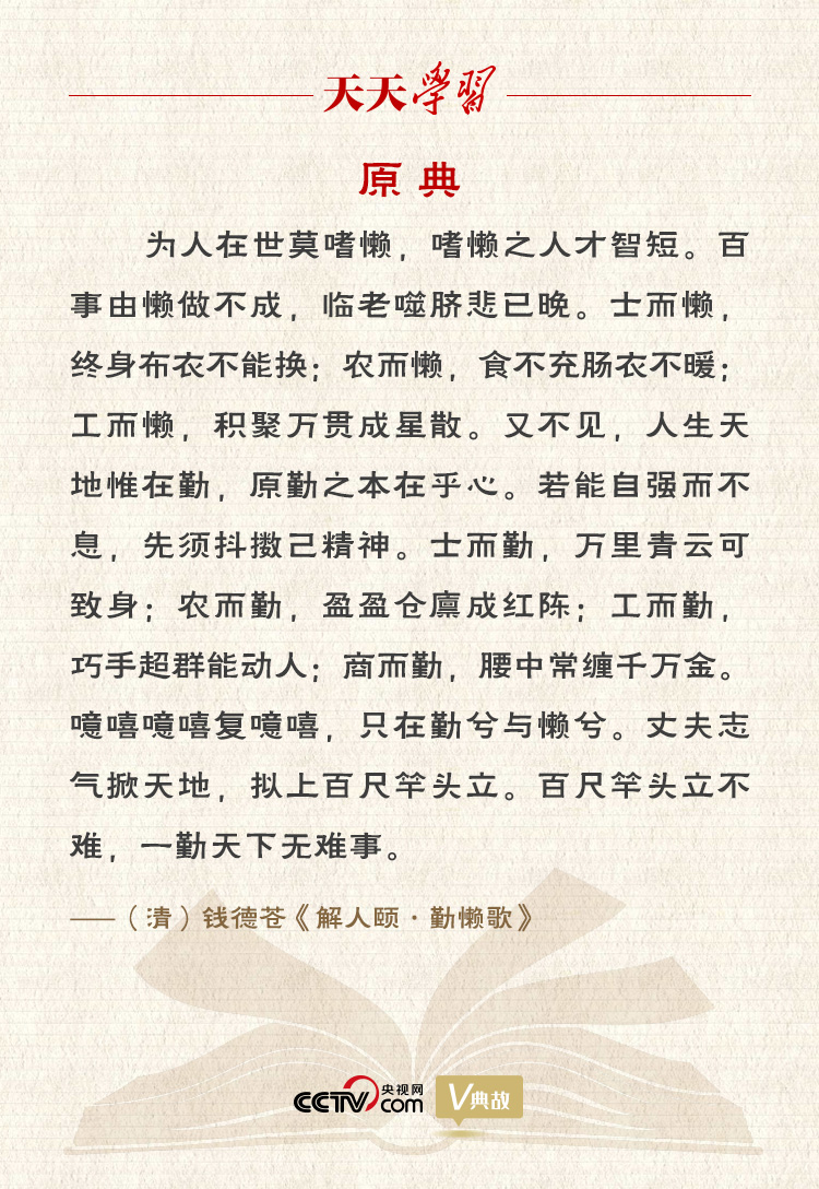 《解人頤》收錄的這首《勤懶歌》,是對(duì)古代的“四民”——士、農(nóng)、工、商勸勤戒懶。結(jié)語“百尺竿頭立不難,一勤天下無難事”,意思是,只要勤奮,天下就沒有難做的事情,即使百尺竿頭也能昂然挺立!鞍俪吒皖^”,佛教比喻道行修養(yǎng)的極高境界,也作“百丈竿頭”。