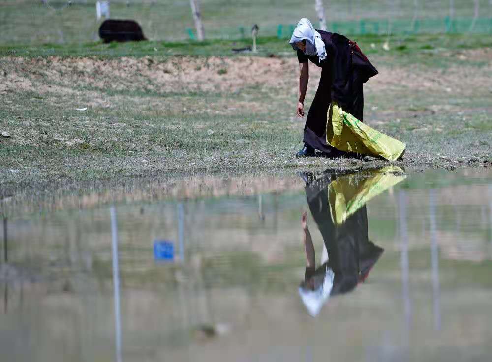 ▲ 2020年8月19日,在青海省果洛藏族自治州瑪多縣瑪查理鎮(zhèn)噶丹村,生態(tài)管護員才讓卓瑪在村子周邊的草原上撿垃圾。