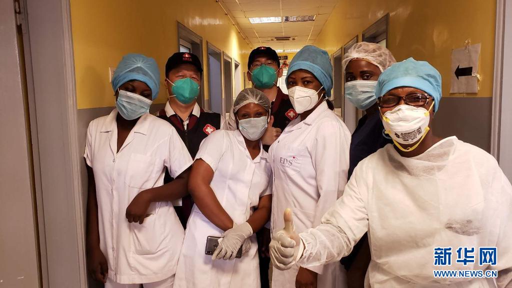 2020年5月26日,中國(guó)抗疫醫(yī)療專家組在剛果(布)首都布拉柴維爾指導(dǎo)新冠肺炎病房建設(shè)時(shí),與當(dāng)?shù)匾痪醫(yī)務(wù)人員合影。新華社發(fā)