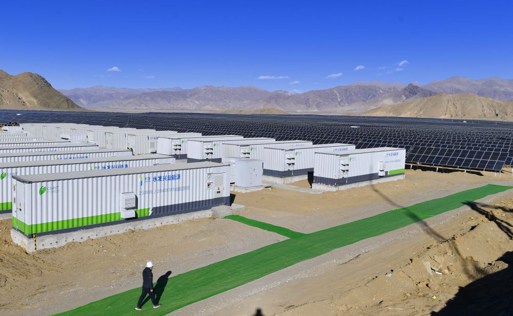 ↑2020年12月24日拍攝的日喀則市江當(dāng)現(xiàn)代生態(tài)產(chǎn)業(yè)示范園內(nèi)的50兆瓦光儲(chǔ)電站儲(chǔ)能系統(tǒng)和太陽能光伏組件。