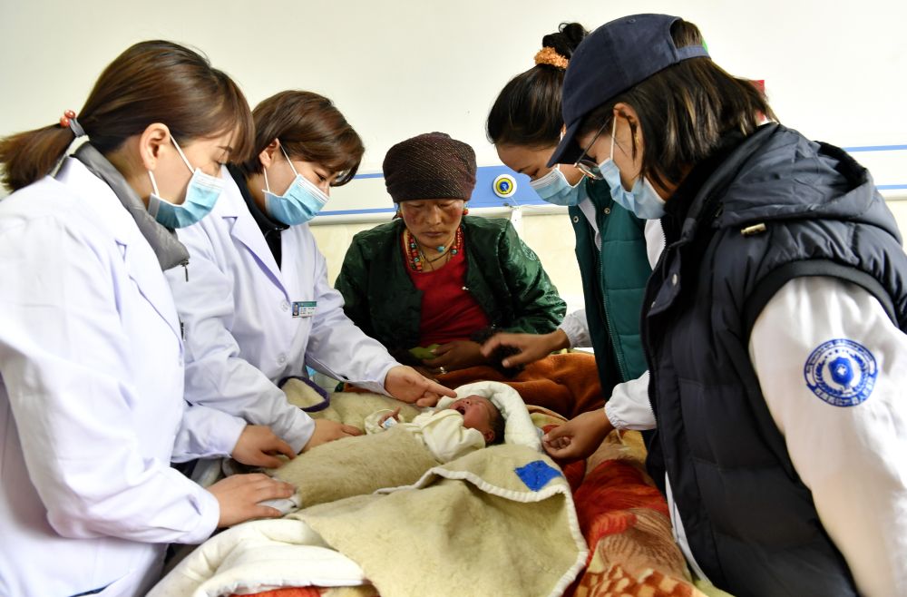 ↑2021年4月21日,在西藏聶拉木縣人民醫(yī)院,山東省煙臺(tái)市第五批援藏醫(yī)療隊(duì)隊(duì)長魏德賢(左二)、護(hù)士長崔雯(左一)和當(dāng)?shù)蒯t(yī)院婦產(chǎn)科主任邊巴普尺(右二)、婦產(chǎn)科醫(yī)生扎桑德吉(右一)查房。