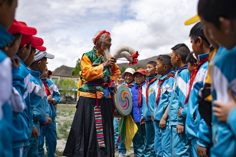 ↑2020年7月2日,國家級(jí)非物質(zhì)文化遺產(chǎn)項(xiàng)目“久河卓舞”傳承人尼瑪在西藏山南市瓊結(jié)縣下水鄉(xiāng)小學(xué)進(jìn)行教學(xué)表演。