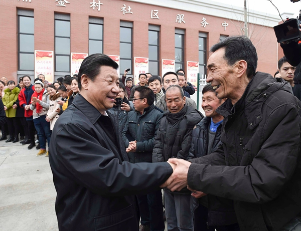 △2015年2月14日下午,習(xí)近平來到陜西省銅川市照金鎮(zhèn),向陜甘邊革命根據(jù)地英雄紀(jì)念碑敬獻(xiàn)花籃并參觀紀(jì)念館。隨后,前往照金村村委會(huì),考察當(dāng)?shù)匕l(fā)展情況,同村民交流,向鄉(xiāng)親們致以新春祝福。