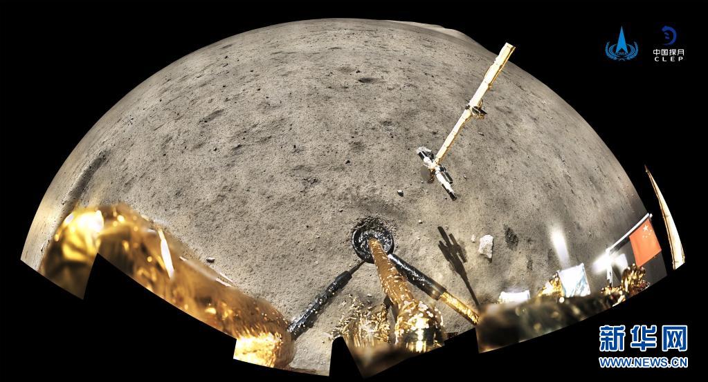 2020年12月4日,國(guó)家航天局公布了探月工程嫦娥五號(hào)探測(cè)器在月球表面國(guó)旗展示的照片。嫦娥五號(hào)著陸器和上升器組合體全景相機(jī)環(huán)拍成像,五星紅旗在月面成功展開(kāi),此外圖像上方可見(jiàn)已完成表取采樣的機(jī)械臂及采樣器。新華社發(fā)(國(guó)家航天局供圖)