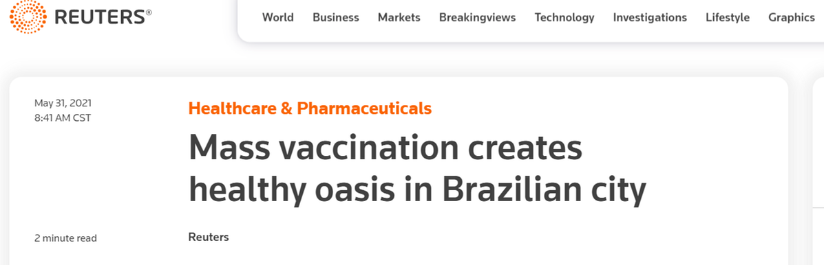 據(jù)英國(guó)路透社5月31日?qǐng)?bào)道,巴西東南部圣保羅州小城塞拉納完成了對(duì)幾乎所有成年人的新冠疫苗接種,擁有4.5萬(wàn)居民的塞拉納已經(jīng)成為巴西疫情中的“健康綠洲”。