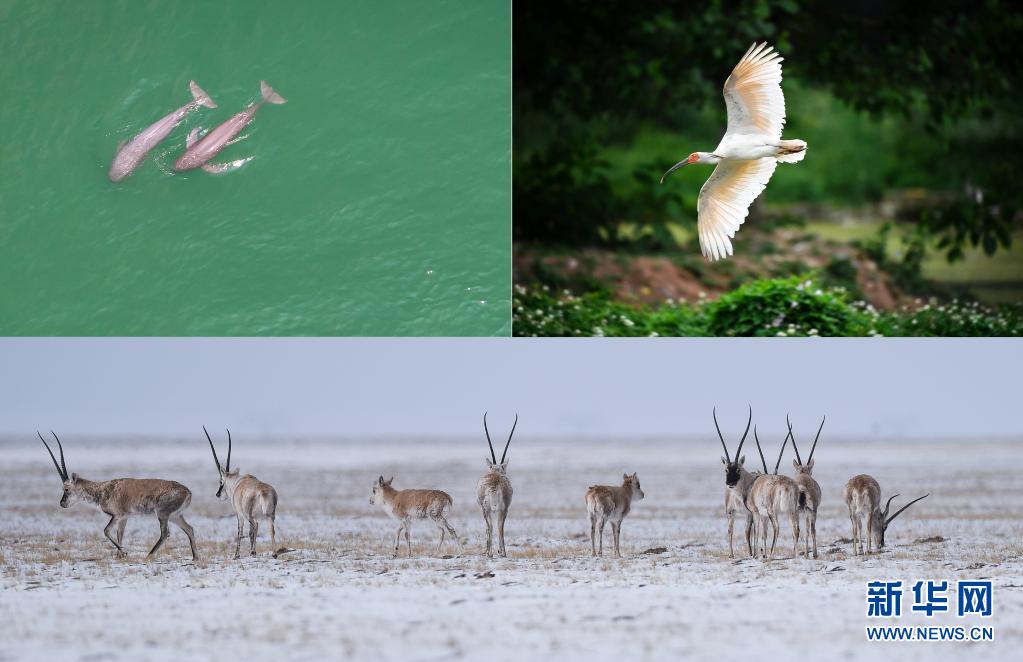 這是一張拼版照片:左上圖為在湖北省宜昌市江邊,長(zhǎng)江江豚在水中嬉戲(無(wú)人機(jī)照片,新華社記者肖藝九5月11日攝);右上圖為陜西省漢中市洋縣朱鹮生態(tài)園內(nèi)的朱鹮(新華社記者劉瀟5月13日攝);下圖為藏羚羊在三江源可可西里地區(qū)活動(dòng)(新華社記者吳剛4月20日攝)。新華社發(fā)