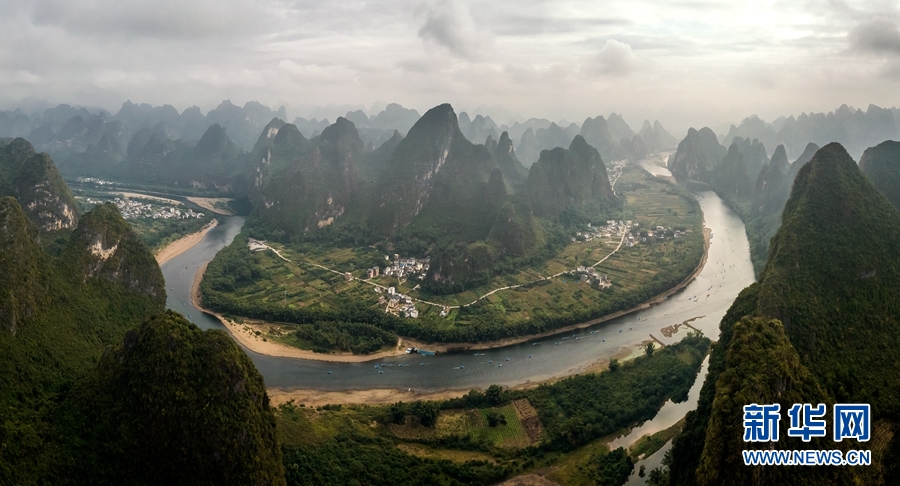 這是2018年10月18日拍攝的廣西桂林陽(yáng)朔縣興坪鎮(zhèn)的漓江景色(無(wú)人機(jī)拼接照片)。新華社記者 李鑫 攝