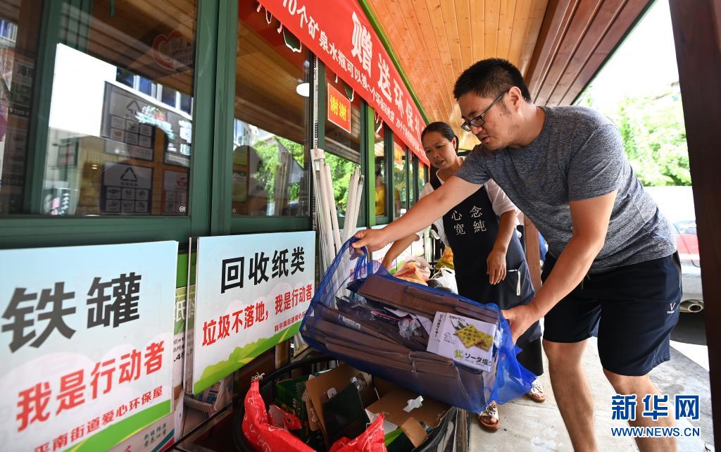 2020年8月25日,居民將生活垃圾送到?谑忻捞m區(qū)和平南街道愛(ài)心環(huán)保屋,用垃圾換取紙巾、肥皂等生活用品。新華社記者郭程攝