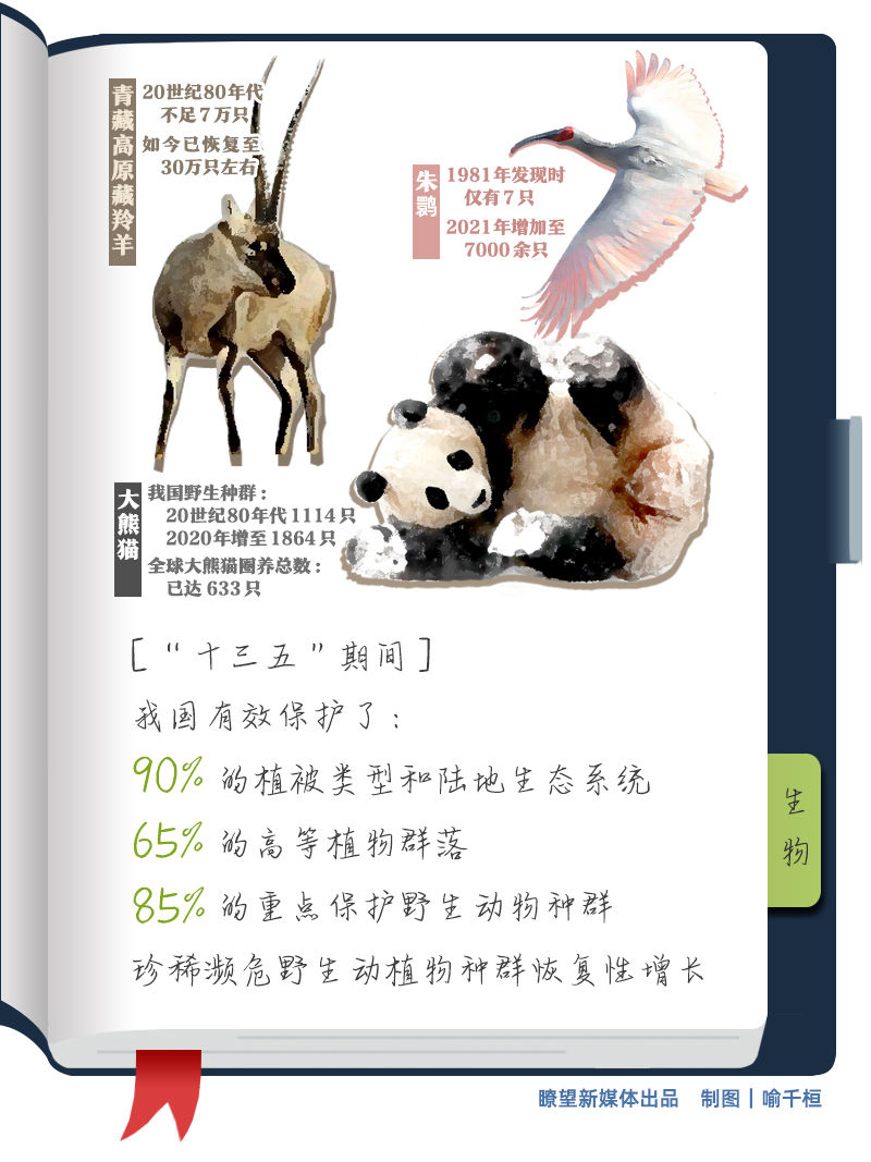 瀕危野生動(dòng)植物保護(hù)不斷強(qiáng)化!笆濉逼陂g,我國有效保護(hù)了90%的植被類型和陸地生態(tài)系統(tǒng)、65%的高等植物群落,85%的重點(diǎn)保護(hù)野生動(dòng)物種群,大熊貓、朱鹮、藏羚羊、蘇鐵等珍稀瀕危野生動(dòng)植物種群實(shí)現(xiàn)恢復(fù)性增長。