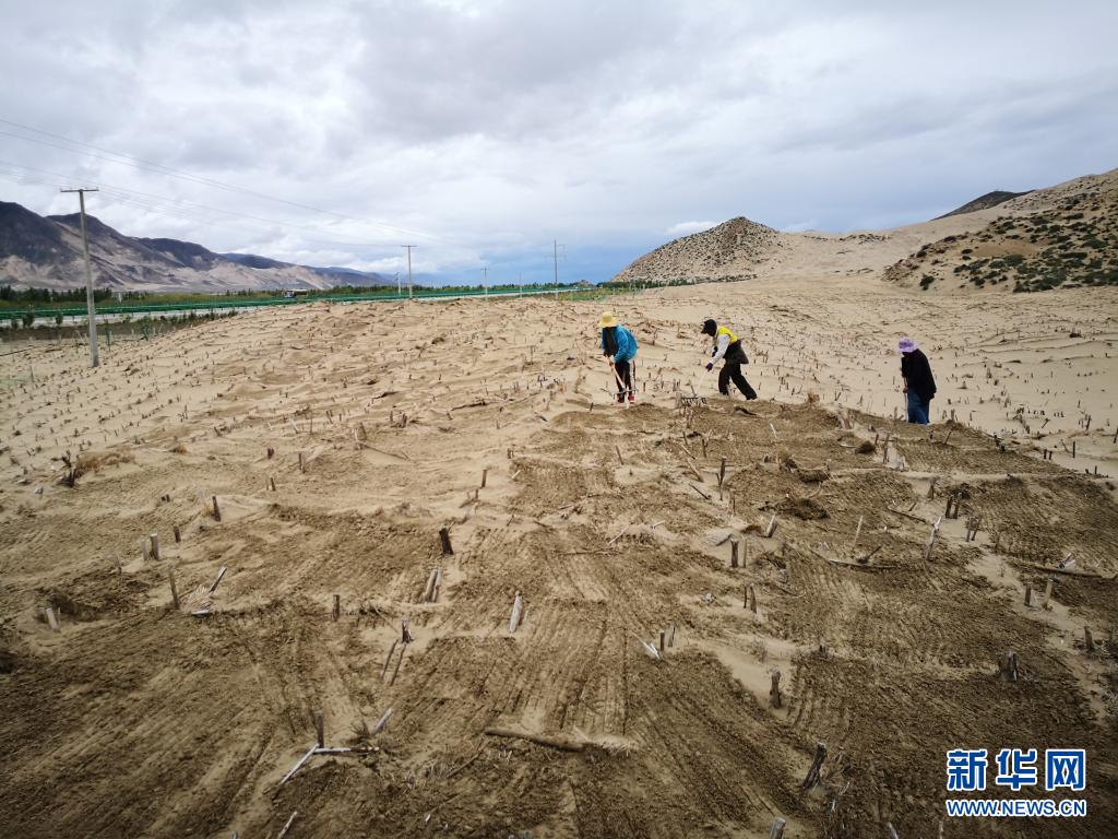 在山南市雅魯藏布江河谷地帶,村民們在維護固沙用的草方格(2019年7月14日攝)。新華社發(fā)(資料照片)