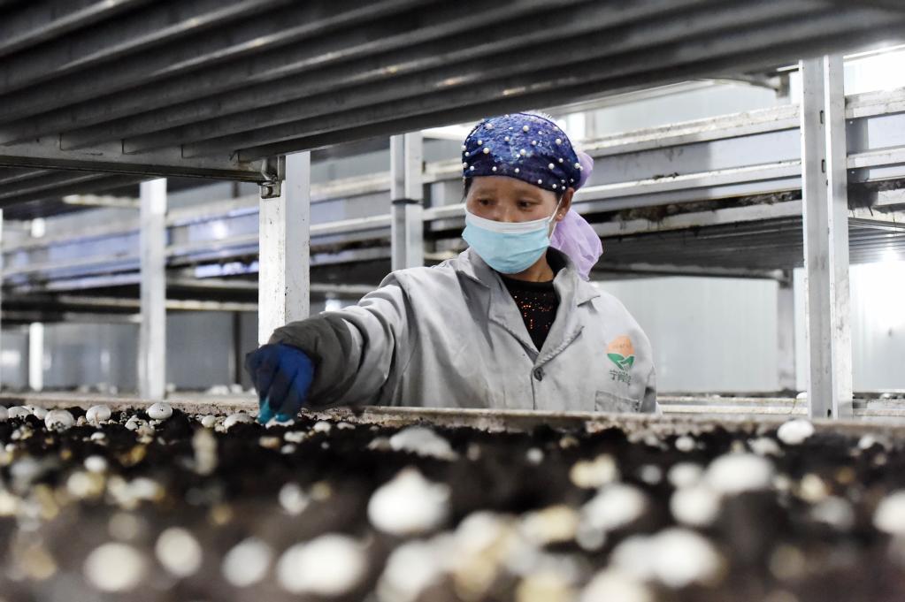 農(nóng)民在寧夏銀川市永寧縣閩寧鎮(zhèn)雙孢菇栽培示范基地采摘蘑菇。新華社記者唐如峰攝