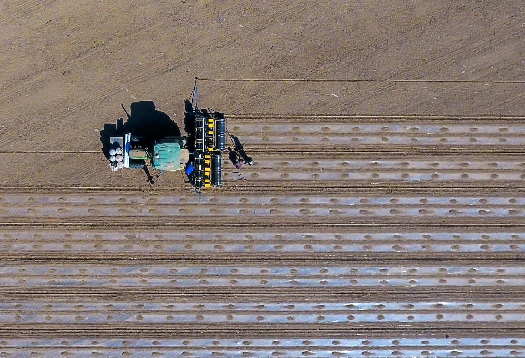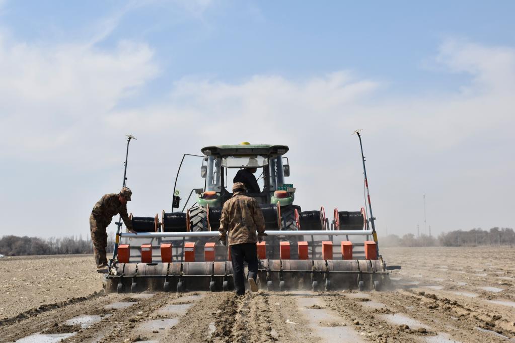 兵團(tuán)職工朱勇強(qiáng)(中)在辣椒播種機(jī)后查看播種效果(2020年3月28日攝)。新華社記者 高晗 攝