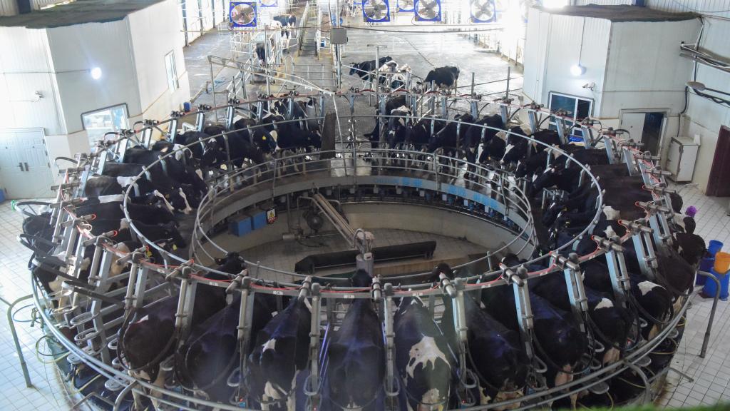 這是在新疆天潤(rùn)乳業(yè)股份有限公司絲路云端牧場(chǎng)拍攝的智能轉(zhuǎn)盤式擠奶廳(2020年5月26日攝)。新華社記者 丁磊 攝