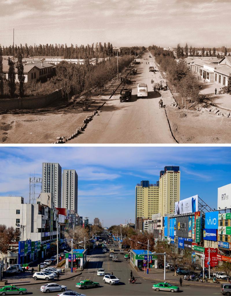 拼版照片:上圖為上世紀(jì)50年代初期的石河子新城街道北子午路(新疆兵團(tuán)農(nóng)墾博物館提供)。下圖為2019年4月9日拍攝的同路段街景。新華社記者 王菲 攝