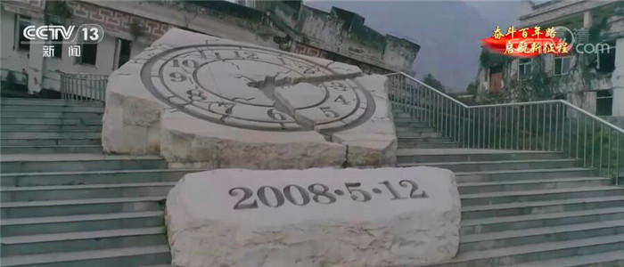 跟隨鏡頭我們來到汶川縣,在映秀鎮(zhèn)漩口中學(xué)遺址,巨大的破碎表盤上,時間永遠(yuǎn)凝固在地震發(fā)生的一刻。教學(xué)樓頂?shù)奈逍羌t旗在地震中屹立不倒,象征中國人民信念不屈、精神永立。