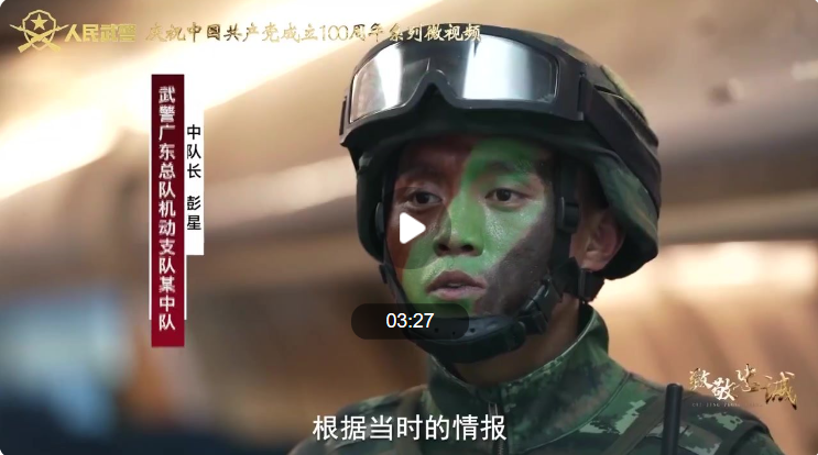 為慶祝中國(guó)共產(chǎn)黨成立100周年,自2021年6月7日起,人民武警新媒體矩陣連續(xù)推出由武警部隊(duì)政治工作部宣傳文化中心制作的40集系列微視頻《致敬忠誠》。本期為您介紹武警廣東總隊(duì)機(jī)動(dòng)支隊(duì)某中隊(duì)中隊(duì)長(zhǎng)彭星。
