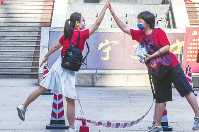 廣西南寧市第二中學(xué)新民校區(qū)考點(diǎn),老師(左)與考生擊掌。