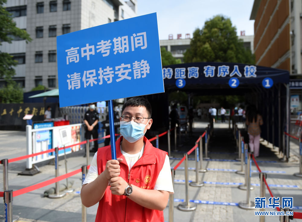 6月7日,在安徽省合肥市五十中學(xué)天鵝湖校區(qū)考點(diǎn),志愿者在考場外維持秩序。新華社記者 周牧 攝