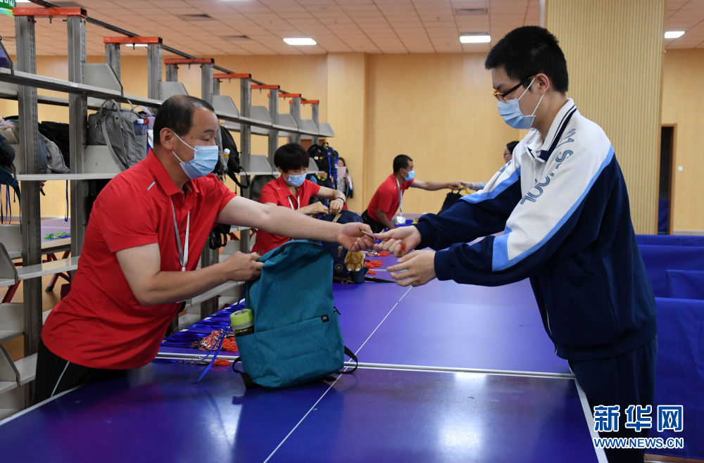 6月7日,在中國農(nóng)業(yè)大學(xué)附屬中學(xué)考點(diǎn),高考考生(右)在存包處存包。新華社記者 任超 攝