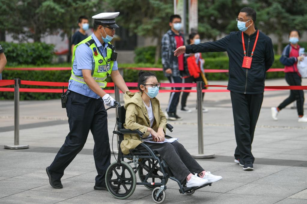 6月7日,交警幫助行動(dòng)不便的考生進(jìn)入內(nèi)蒙古呼和浩特市第二中學(xué)(西校區(qū))考點(diǎn)。