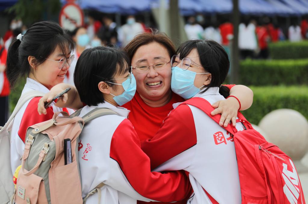 在河北省固安縣第一中學(xué)考點(diǎn),考生結(jié)束首場(chǎng)科目考試后與老師擁抱。