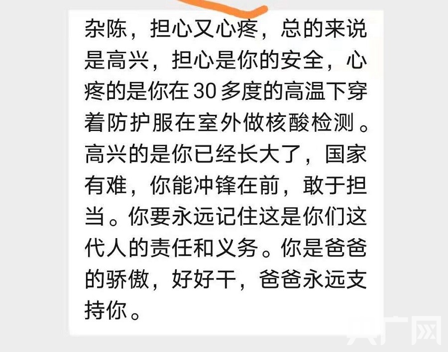 那天的核酸采樣工作直到凌晨三點(diǎn)才結(jié)束,胡洋洋回到家中已經(jīng)是凌晨四點(diǎn)多。但沒想到,一向沉默寡言的父親,不僅一直在等著自己,還留下了一段話。