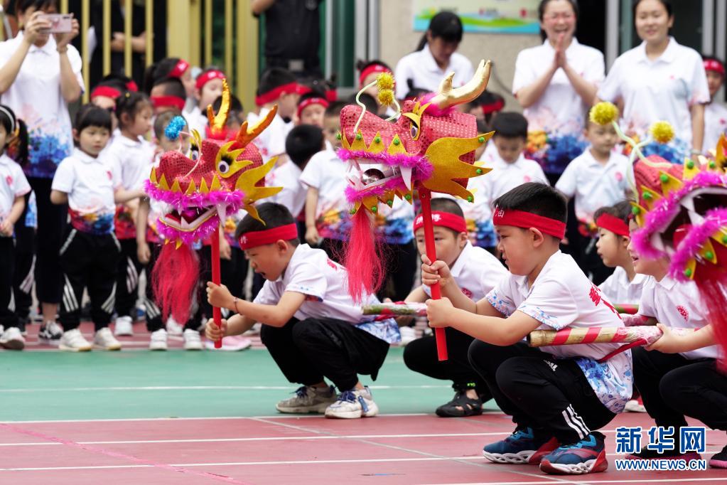6月10日,在重慶市北碚區(qū)縉云幼兒園,孩子們參加旱地龍舟比賽。