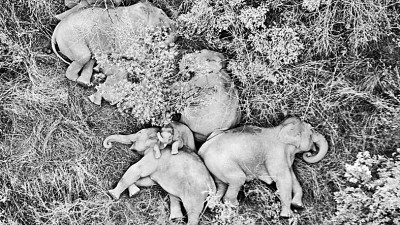 近日,一張由云南省森林消防總隊(duì)無人機(jī)監(jiān)測(cè)任務(wù)分隊(duì)監(jiān)測(cè)拍攝的照片走紅網(wǎng)絡(luò),畫面中亞洲象群在昆明市晉寧區(qū)夕陽鄉(xiāng)賴家新村山林地里睡覺休息。云南省森林消防總隊(duì)供圖