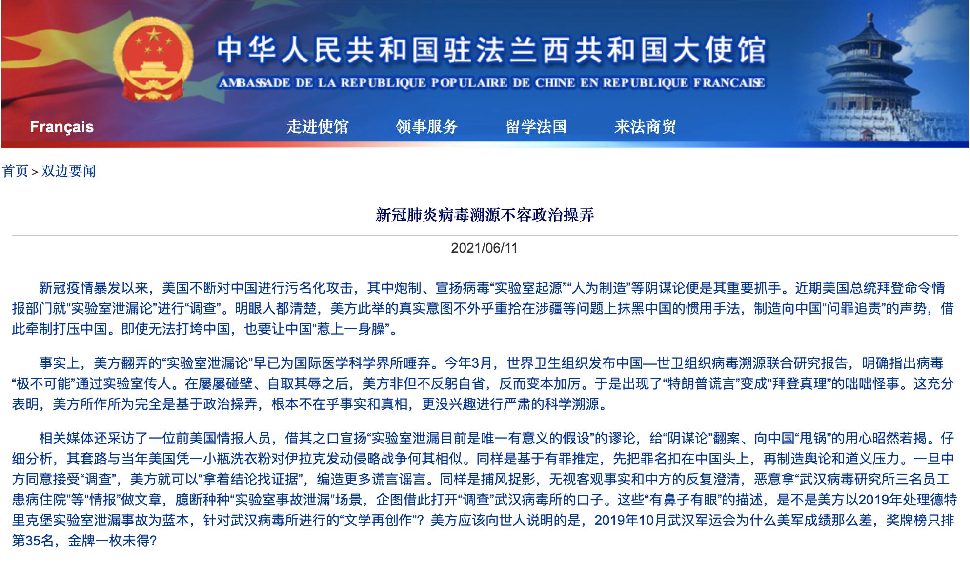 當地時間6月11日,中國駐法國大使館發(fā)表了題為《新冠肺炎病毒溯源不容政治操弄》的文章,全文如下: