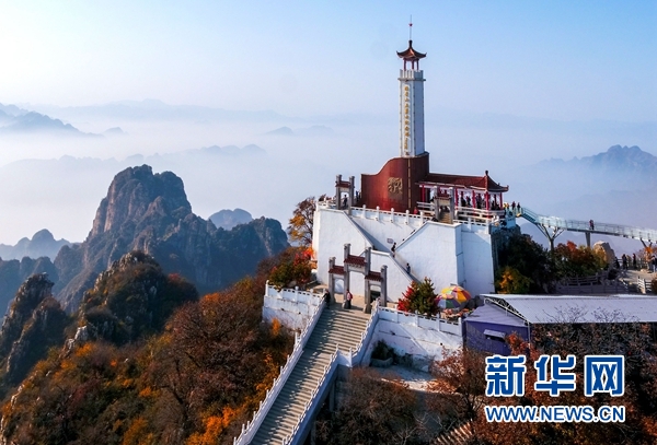 這是狼牙山棋盤陀峰頂?shù)摹袄茄郎轿逵率考o念塔”(2017年10月27日無人機拍攝)。新華社發(fā)
