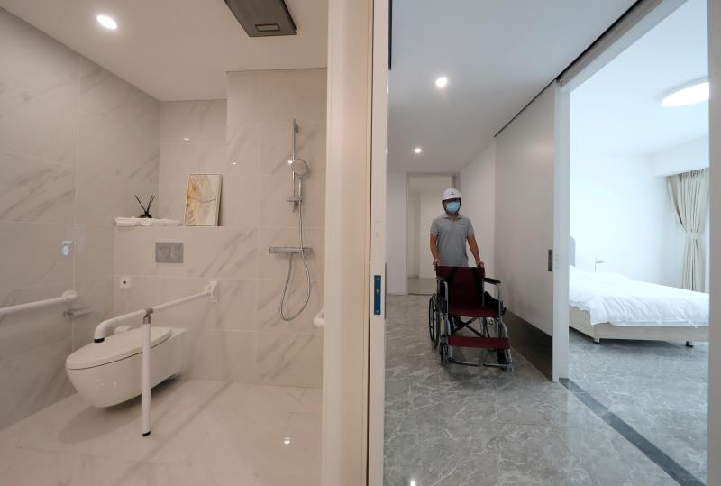 工作人員展示北京冬奧村無障礙建設(shè)情況。圖片來自北京市重大項(xiàng)目辦