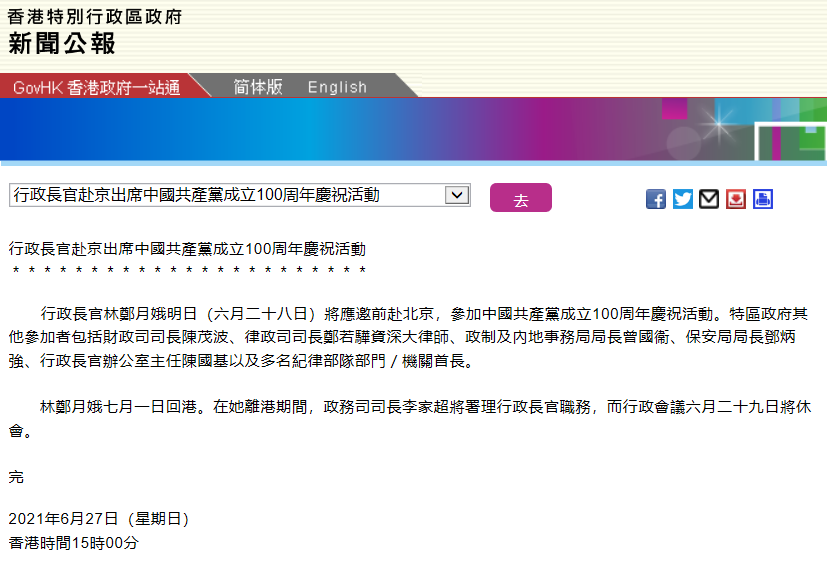 港府公報(bào):林鄭月娥28日將赴京出席中國共產(chǎn)黨成立100周年慶祝活動(dòng)