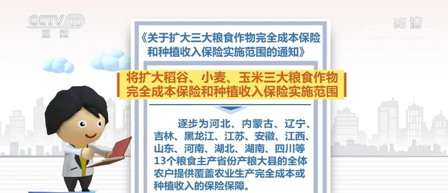 根據(jù)《通知》,將擴(kuò)大稻谷、小麥、玉米三大糧食作物完全成本保險(xiǎn)和種植收入保險(xiǎn)實(shí)施范圍,逐步為河北、內(nèi)蒙古、遼寧、吉林、黑龍江、江蘇、安徽、江西、山東、河南、湖北、湖南、四川等13個(gè)糧食主產(chǎn)省份產(chǎn)糧大縣的全體農(nóng)戶提供覆蓋農(nóng)業(yè)生產(chǎn)完全成本或種植收入的保險(xiǎn)保障。2021年覆蓋實(shí)施地區(qū)500個(gè)產(chǎn)糧大縣,2022年實(shí)現(xiàn)13個(gè)糧食主產(chǎn)省份產(chǎn)糧大縣全覆蓋。
