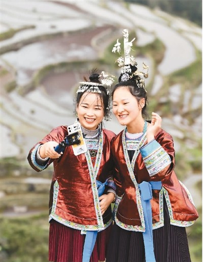 圖為貴州省從江縣加榜鄉(xiāng)加車村村民直播推介加榜梯田風光。